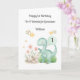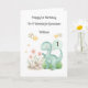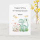 This birthday card is suitable for a grandson or son's first, 2nd or 3rd birthday. The design includes the number 1 (which can be changed or removed), birthday stars, watercolour grass, flowers and rocks, and a blue dinosaur with balloon.