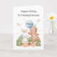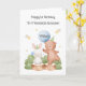 This birthday card is suitable for a grandson or son's first, 2nd or 3rd birthday. The design includes a watercolour woodland rabbit with party hat and birthday gift and a brown bear with party hat and balloon. The child's name can be added inside the balloon or be replaced with the child's age.
