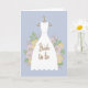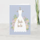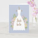 This is a Bridal Shower card with a beautiful white wedding dress on a hanger with flowers behind and around it. The text says ‘Bride to be.’