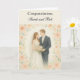 This wedding card features a watercolor illustrated image of bride and groom with floral frame. A template created card with an inside message. this card is a thoughtful way to congratulate the bride and groom ,