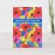 Tarjeta de cumpleaños colorida con "Feliz Cumpleaños" en galés, con escarlata, pasteles naranjas y rosados y flores de maíz azul brillante, de una pintura acuarela de Judy Adamson.