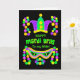 Una tarjeta de felicitación vibrante coloreada del carnaval para una esposa, con una corona, una máscara y una cadena de gotas en verde claro, púrpura y amarillo en un fondo negro. Usted puede cambiar el mensaje interior si usted desea.