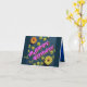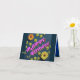 Esta alegre tarjeta de cumpleaños cuenta con un brillante fondo azul decorado con flores y estrellas amarillas brillantes. El mensaje en la parte delantera dice "Cumpleaños feliz" con una letra rosa brillante con estrellas doradas. En el interior de la carta hay un jarrón de flores de colores sobre un fondo azul. La tarjeta dice "Te deseo un día lleno de amor, alegría y todas tus cosas favoritas. ¡Feliz cumpleaños!"