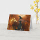 Una bruja con un rico vestido verde y el vello de jengibre lanzando un hechizo contra un rico fondo de color otoñal con caldero, palo de escoba y gato negro.