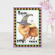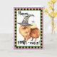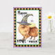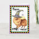 Envíe los saludos de Halloween con esta tarjeta de un Pomeranian lindo que lleva un gorra de la bruja adornado con una araña tonta. Grande para los niños de todas las edades que aman Poms y Halloween. ¡Tenga un Aullido-oween feliz!