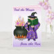 Cuto diseño de Halloween de la pequeña bruja con su libro de hechizos. Tiene un gorra de bruja y bata con símbolos y caldero mágico. Texto de tarjeta dice... Siente la magia, Únete a la diversión.