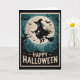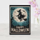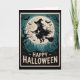 Tarjeta Bruja espeluznante de Halloween volando a través d