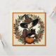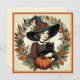 Esta tarjeta de saludo de Halloween tiene un aspecto retro y presenta una bruja de bonito en un gran gorra de brujas, un gato negro y una calabaza. Está rodeada por una corona de ramas y hojas en colores de otoño bonito. Es una preciosa tarjeta de Halloween para usar como invitación, como regalo o como temporada espeluznante de Halloween.