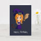 Una tarjeta de cumpleaños con una bruja linda que lleva un gran gorra de brujas moradas. Su gato negro descansando sobre su cabeza. Ella tiene el pelo largo naranja y lleva una escoba. El ilustracion personalizado es perfecto para halloween.