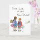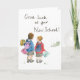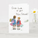 Una tarjeta de ‘Buena Suerte en tu nueva escuela' que caerá bien con cualquiera que empiece la escuela por primera vez. Una niña y un niño más pequeño están parados a los pies de los pasos de la escuela con sus mesitas de comida y mochilas y el chica lleva un ramo de flores para el profesor y le cuenta al niño acerca del maravilloso tiempo que tendrá en la escuela. El diseño fue pintado a mano con acuarelas por Judy Adamson.