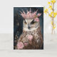 Un búho en una corona con flores rosadas todas las ocasiones en blanco dentro de la tarjeta de saludo