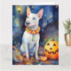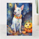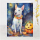 Tarjeta Bull Terrier de Halloween con calabazas Espantoso