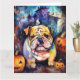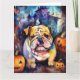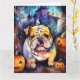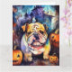 Tarjeta Bulldog de Halloween con calabazas espeluznante