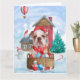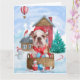 Tarjeta Bulldog Inglés en casa de perro navideña con nieve