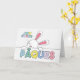 Un lindo ilustracion de un conejo de Pascua con letras pastel para la Pascua Feliz creado en francés con el interior que dice: "¡La diversión de Pascua y las sorpresas para alegrar este maravilloso día! ¡Feliz Pascua!"
