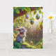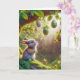 Un conejito curioso admira los huevos hermosamente decorados que cuelgan de las ramas de un árbol verde y exuberante. El texto se puede cambiar.