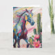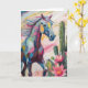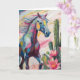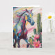 Un cuadro abstracto moderno y vibrante que representa a un caballo rodeado de cactus y suculentos en suaves tonos pastel. El caballo se representa con toques de color audaz, mientras que las plantas del desierto se pintan con una mezcla de verdes, rosa y azul. La fusión de formas orgánicas y tonos vivos crea una composición divertida pero relajante, combinando elementos naturales con un toque artístico contemporáneo.