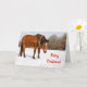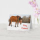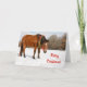 Caballo bayo en la nieve, con corona de Navidad alrededor del cuello, deseando Feliz Navidad; agregue su propio texto en el interior