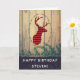 Tarjeta de felicitación por cumpleaños con estilo rústico. Diseñado con una cabeza de ciervo con cuerdas, hecho de yeso rojo. Un marco ovalado elegante rodea la imagen. Los tablones de madera falsos le dan un aire campestre exterior. Mensaje personalizado en el interior.