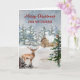 Feliz Navidad para una tarjeta de amistad con una encantadora escena de una rústica cabaña en el bosque con un ciervo en la nieve y un verso reflexivo.