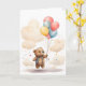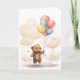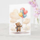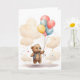 Adorable cachorro de oso de acuarela con globos de colores flotando por el cielo rodeado de nubes. Tarjeta de felicitación en blanco para cumpleaños, aniversario, nuevo bebé, gracias, etc.