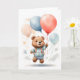 Adorable cachorro de oso de acuarela con globos de colores flotando por el cielo rodeado de nubes. Tarjeta de felicitación en blanco para cumpleaños, aniversario, nuevo bebé, gracias, etc.