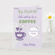 Personalice esta tarjeta de felicitación de cumpleaños con un nombre y cambie el otro texto si lo prefiere. Diseñado en púrpura y verde con una taza de café, puntos de polka y corazones de amor. Trata a tu mejor amigo a un café.