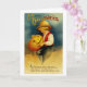 Vintage ilustracion de tarjetas de felicitación de Halloween que muestra a un niño victoriano tallando una linterna de jack o' con el texto "Es Halloween cuando los niños se asustan por el menor ruido, y las niñas se van corriendo a la cama y suben rápido, y esconden su cabeza".