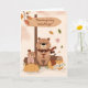 Una dulce tarjeta de Acción de Gracias con una acogedora escena otoñal de bosques con un oso en una bufanda bebiendo algo caliente, un zorro acurrucado en las hojas y un pequeño ratón encaramado en una calabaza. El cartel de madera dice "Saludos de Acción de Gracias" para un suave toque estacional. Con suaves colores otoñales y un ambiente de bosque de artesanías, esta carta es una manera reflexiva de enviar cálidos deseos, gratitud y tranquilidad en el Día de Acción de Gracias.