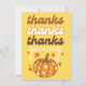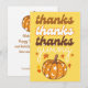 Una colorida tarjeta de saludo con un elegante texto de tipografía "gracias, gracias gracias gracias", y calabaza de groovy caída. La tarjeta incluye un maravilloso mensaje de bienvenida en la parte posterior que puede ser personalizado.