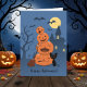 Un gato negro y una escoba de brujas cerca de una pila de calabazas que se están cayendo. Un árbol muerto, una mansión espeluznante, algunos murciélagos y la luna son vistos en el fondo.