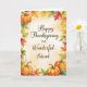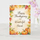 Un sincero diseño de Acción de Gracias para un amigo especial, con calabazas otoñales y coloridas hojas otoño en cálidos tonos estacionales. El sentimiento de frente expresa gratitud y amistad, con un mensaje en su interior que continúa con el tema de las bendiciones y los preciados recuerdos. Perfecto para enviar deseos de vacaciones reflexivas a un querido amigo que significa tanto.