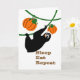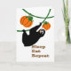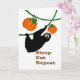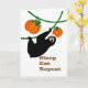 Graciosa celebración de eslóganes, fiesta de gracias, calabazas, tarjeta de saludo de papel. La pereza negra aguda está comiendo calabazas mientras cuelga sobre una vid. Duerme, come, repite las palabras en la cubierta. Divertido mensaje dentro sobre las direcciones de la fiesta de eslogans. Arte, imagen y verso copyright © Shoaff Ballanger Studios.