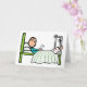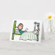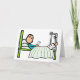 El diseño de la cama de hospital muestra a un stickman leyendo una tarjeta mientras está acostado en la cama. Tiene una pierna rota en un yeso firmado levantada por equipo especial. El paciente tiene almohadas cómodas y una actitud resignada relajada ante una estadía en el hospital. ¡Recupérate pronto!
