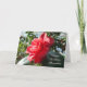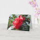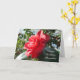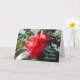Una vibrante tarjeta de cumpleaños mostrando una flor camélica roja floreciendo al sol, con la opción de personalizar el frente, el interior y el reverso con un nombre y tu propio mensaje especial.
