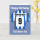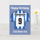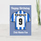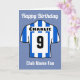 Personalice esta tarjeta de cumpleaños de la camisa del club de fútbol con un nombre, número y nombre del club de fútbol. Rayas azules y blancas. Feliz cumpleaños, hincha de fútbol. Tarjeta para un hincha de fútbol loco.