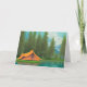 Tarjeta de cumpleaños feliz con un tema de camping con un hermoso arte de IA con una gran carpa en el lago con pinos y montañas en el fondo.