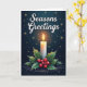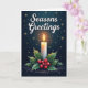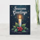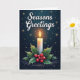 Share the warmth of the season with this elegant holiday card featuring a glowing candle nestled among holly leaves and berries. Set against a rich midnight blue background sprinkled with stars, the design evokes peace, hope, and festive charm. The graceful “Season’s Greetings” script adds a timeless touch, making this card perfect for sending heartfelt wishes to friends, family, or colleagues.