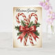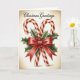 Send sweet holiday wishes with this vintage-style card featuring two red-and-white candy canes crossed and tied with a bold red ribbon. Holly leaves and berries add a festive touch, while the aged beige background and “Christmas Greetings” script evoke timeless charm.