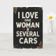 The Christmas greeting card showcases a whimsical and cheeky design that is sure to bring a smile to anyone's face. The bold, vintage-style cracked white lettering stands out against the distressed black background, adding a touch of edginess to the card. The message, "I LOVE ONE WOMAN & SEVERAL CARS," is sure to resonate with car enthusiasts and those who appreciate a good laugh. Festive touches like holly and berries border the design, adding a touch of holiday cheer 🎅🏼🎄🎁. The font is playful and inviting, drawing the customer in to spread some holiday joy. Perfect for spreading laughter and cheer this holiday season, this Christmas card is a must-have for those with a great sense of humor.