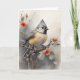 Carbonero crestudo posado en una rama de árbol rodeado de hermosas flores rojas. Tarjeta de felicitación en blanco para cumpleaños, aniversario, nuevo bebé, gracias, pésame, etc.