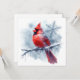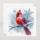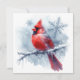 Tarjeta Cardinal de invierno con copos de nieve en rama he