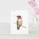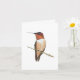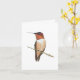 Tarjeta de saludo en blanco con un colibrí Rufous encaramado en una rama.