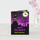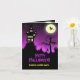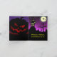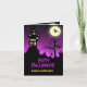 Una casa encantada asustadiza se encaramó encima de una colina con una yarda grave contra un cielo púrpura oscuro. Hay una Luna Llena con un vuelo travieso de la bruja a través de él. Mismo diversión y diseño asustadizo para su tarjeta de felicitación de Halloween.