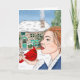 Arte dibujado a mano. La primera nevada. Una dama sosteniendo un cardenal en un día invernal nevado frente a una casa rural inglesa. Tarjeta en blanco.