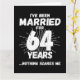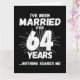 Gracioso regalo por el 64º aniversario del boda para parejas que han estado viviendo la vida de casadas durante 64 años y que han visto y escuchado todo y nada les asusta. Perfecto para una pareja casada que celebra 64 años de matrimonio con un fiesta del 64 aniversario de boda! Este regalo para el aniversario de la novedad le dará muchas risas a su esposo, esposa o invitados fiestas. Meme de aniversario del matrimonio divertido titulado 'He estado casado 64 años, nada me asusta'.