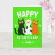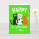 This design shows three stylized cats sitting close together on a lime green background, their bodies touching as if they’re posing for a friendly family photo 💚. A sleek black cat sits beside a white cat with dark spots and a warm orange cat, all with bright yellow eyes and small smiles that make them look comfortably content with one another. Pink noses and pink inner ears add a gentle, affectionate touch to their faces, like they’ve just shared a quiet joke. Across the top, the word “HAPPY” appears in large uppercase letters with a shadowed edge, standing out strongly against the green. Beneath the cats, “ST. CATTY’S DAY” is centered in uppercase text, and “Family” sits below it, framed by two small white shamrocks ☘️. The art uses simple shapes and soft drop shadows to give the cats and lettering a slight lift from the background. Small white shamrocks sit near the lower text, echoing the St. Patrick’s Day theme against the lime green field.
