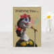 Deseándote un Feliz Día del Cumpleaños Muerto, tarjeta de saludo de papel con una figura de esqueleto femenino de mache de papel cantando en un micrófono. Está adornada con rosas rojas, un lazo y un arco de oro y vestido con acento dorado. Arte, imagen y verso copyright © Shoaff Ballanger Studios, 2022.