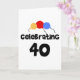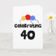 Tres globos de colores primarios y texto negro que dice "Celebrando 40" en tarjetas de 40 años, camisetas, tazas y más.