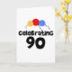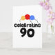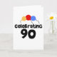 Tres globos de colores primarios y texto negro que dice "Celebrando 90" en tarjetas de cumpleaños 90, camisetas, tazas y más.